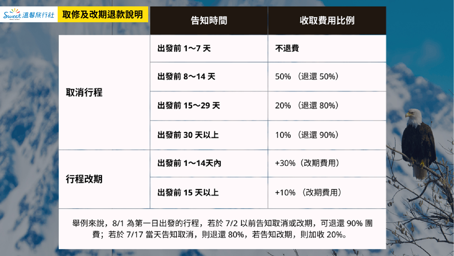 如因交通工具故障、個人健康問題、天氣變化等不可抗力或個人因素導致無法如期參團,需取消或改期,我們將盡力協助降低損失。但請注意,若無法參加部分行程或已包含的服務,恕無法退還部分費用。