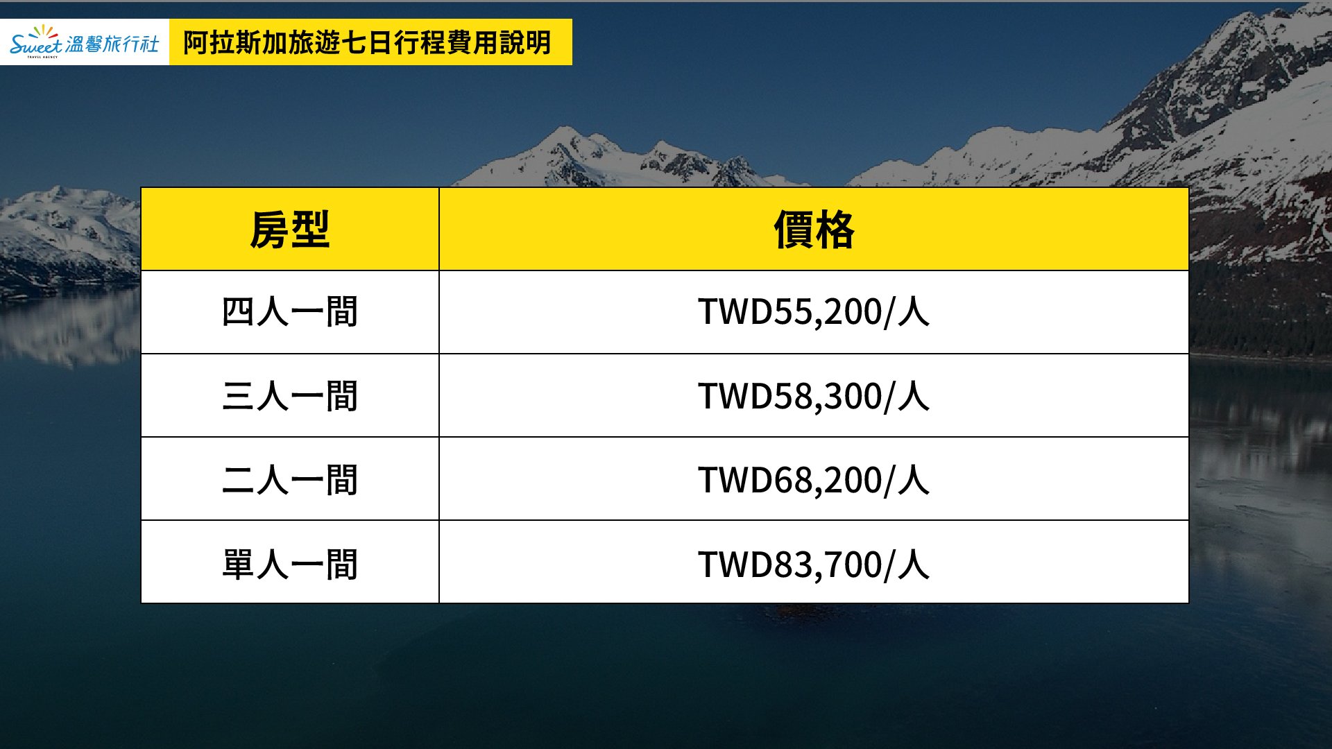 •	為便利旅客,原則上七天皆安排在同一間飯店,但冬季阿拉斯加旅遊熱門,仍需視訂房狀況而定。