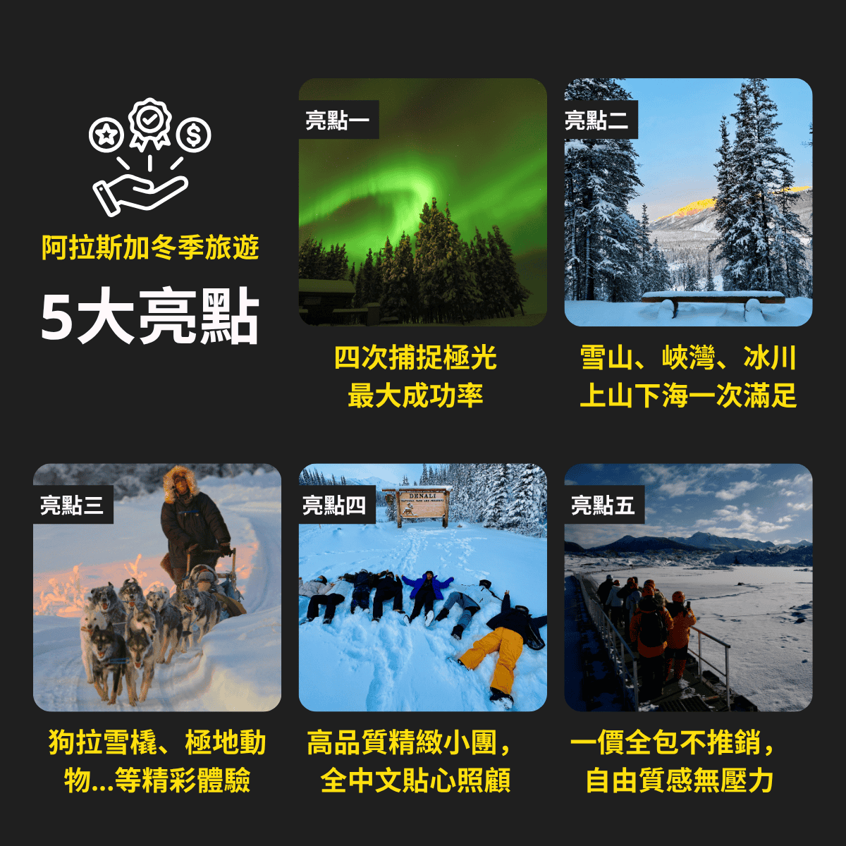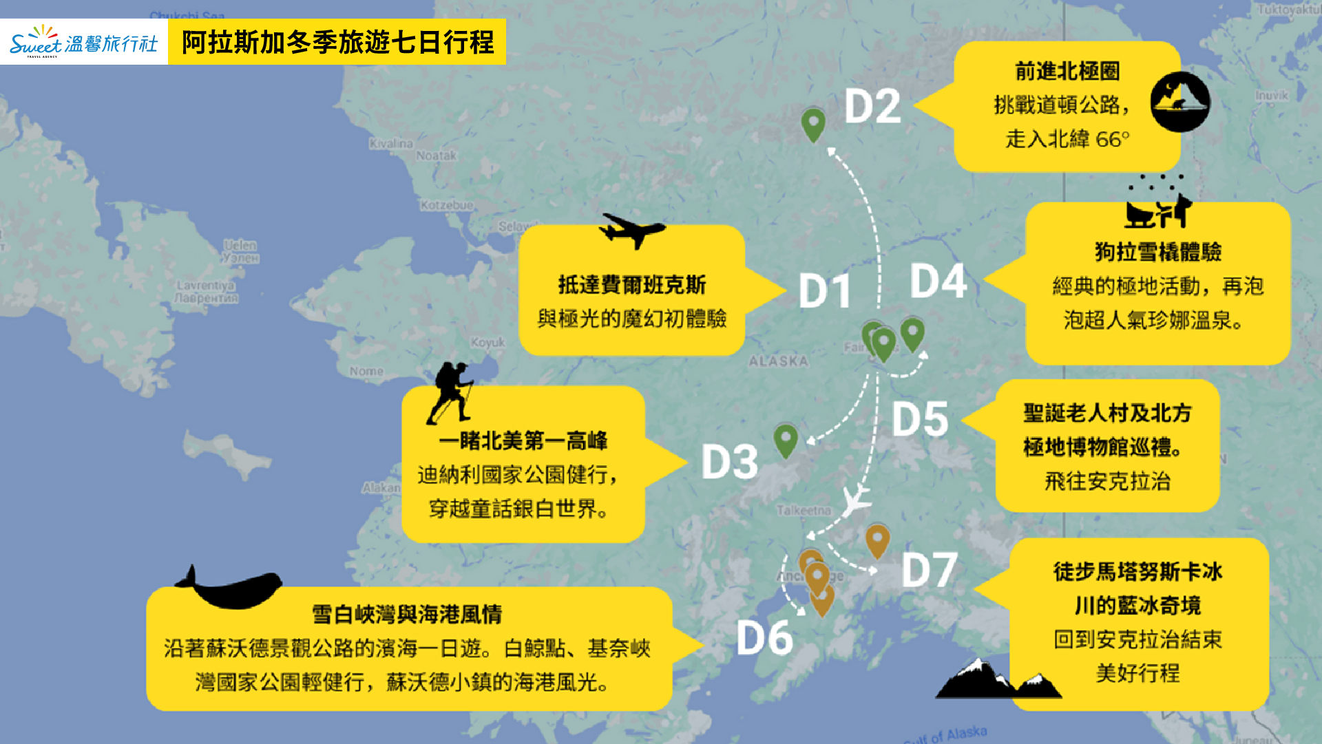 從費爾班克斯的極光初見,到迪納利雪林漫步、狗拉雪橇的歡笑、珍娜溫泉的冰火雙享受,再到冰川與海灣的深刻洗禮。